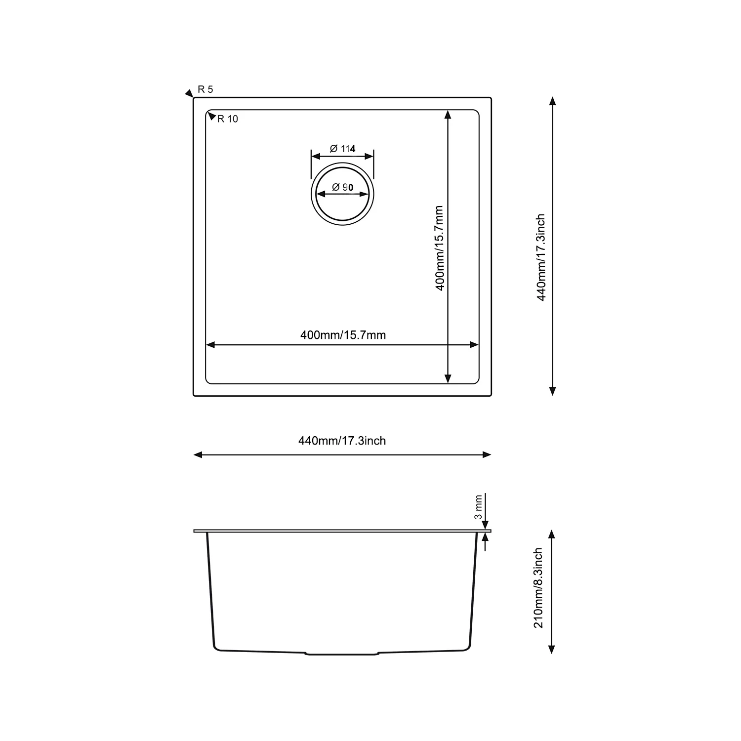 Kompaktowy format 44×44 cm – idealny do mniejszych kuchni lub jako dodatkowy zlew pomocniczy.